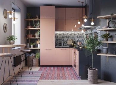 • Tủ bếp chữ L là kiểu thiết kế thích hợp với hầu hết các không gian bếp. Thiết kế này giúp người nội trợ giảm thiểu khoảng cách di chuyển trong quá trình nấu nướng và cung cấp không gian lưu trữ tối đa cho nhà bếp.
