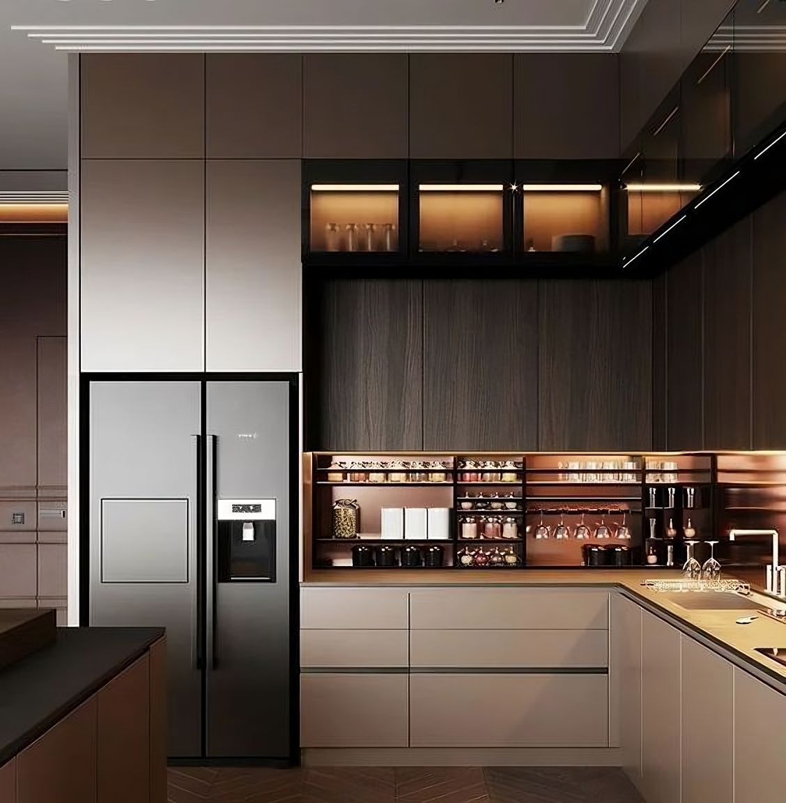 ♦ Còn với phong cách cổ điển, tân cổ điển thì bạn nên sử dụng tủ bếp bằng gỗ tự nhiên (gỗ óc chó, xoan đào, sồi nga, sồi mỹ, gỗ hương…) có những đường chỉ, hoa văn bắt mắt, ấn tượng cùng màu sắc tự nhiên mang đến sự ấm cúng cho căn bếp của gia đình.